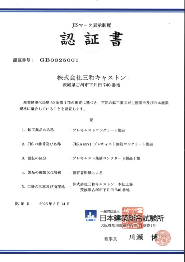 (JISA5371 プレキャストコンクリート 認定番号389073)平成04年1月